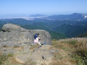 | 山頂から見た平尾台や貫山(12:16) | 山頂で食事 | |