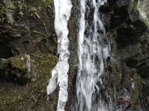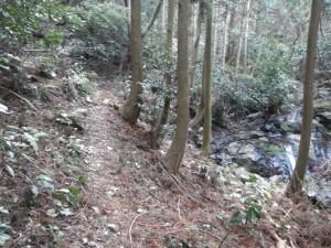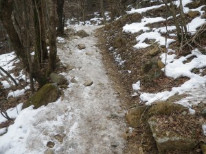 | 谷へと降る | 沢沿いの道となる | 凍っている |