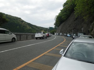 | 登山口に到着・・・秋には紅葉がきれいだろう(13:56) | 赤い吊橋が見えた | 未だ車がたくさん停めてある(14:28) |