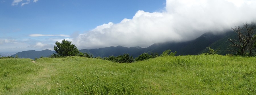 2015年7月20日(月) 天気 曇り時々晴れ ■出発時間:午前7時30分(自宅) ■メンバー:単独 本当は今頃、南アルプスを歩き終わって自宅で写真の整理でもしているはずなんだが・・・・・・。 立て続けにやってくる台風に今回の白根三山登山計画は中止した。もっとも電車が運休してしまったので登山口まで行くこともできなかった。 空は相変わらずどんよりして今日も予報では曇りのち雨である。 普通なら諦めるところであるが、何しろ今月になって一度も山を歩いていない。平気でいられるわけがない。ましてや連休であるのに家にいても何もすることがない。ただテレビを見てビールを飲んでお腹に脂肪を貯めるだけである。 「ま、降ってもいいや」と福智山へ出かけることに。西に車を走らせると青空が広がってきたが福智山に近づくと頂上部はガスに覆われてるのがわかる。 とにかく歩き始めるが、3週間のブランクはとても堪える。暑い、きつい、息が苦しい。八丁ルートを選んだのが間違いだったか・・・・・。 それでもゆっくりと歩く。森林浴は久しぶりだし、この八丁ルートも久しぶりでずいぶんと歩きやすくなった感じがする。賑やかな女性群のパーティを追い抜くと鳥の囀りが代わって賑やかになる。 最近ではウグイスよりもソウシチョウが目立つ。ソウシチョウはきれいな声で鳴くがボリュームが大きく近くで鳴かれると少々やかましい。見える範囲に近づくと私に気付いたのか背を伸ばし警戒態勢に入った。鳴きやんだと思ったら今度は「じぃーじぃー」と鳴き出した。孫に「じぃー」と呼ばれのは何とか我慢できるが、小鳥から言われるとは情けない。頭にきて睨みかえすと後ずさりするように木の上へと跳ねて行った。 そうこうして鳥に遊ばれているといつの間にか、私よりもじぃーの人から追い越されてしまう。(失礼) 急登が続き灌木帯から草原に出るとガスに覆われたピークを越える。この先に山頂が見えるはずであるが、ガスって見えない。前から先ほど追い越していった方が他の人を連れて降りてきた。健脚な人である。 最初の祠が見えるとすぐに山頂だ。ガスは抜けそうにない。登山者はこの展望の利かない頂上では長居をしない。ランチタイムをするにも少々早すぎる。 私も早々に下山始める。ガスのかからない鷹取山でランチにすることにして。 上野越(あがの)から鷹取山へ登り返すと、うそのような晴天で見晴らしは最高である。福智山頂上部は相変わらずガスっている。城跡の頂上はカワラナデシコなどの花々が咲いて陽射しは暑いが風が心地よく寝ころぶと気持がよい。のんびりと過ごして登山口へと下山した。帰路では2匹の蛇に遭遇したが無事下山。今日も自然に山に感謝!! ■コースタイム P-(8分)-上野登山口-(5分)-八丁ルート分岐-(40分)-おおつが林道-(50分)-福智山頂上-(25分)-上野越-(13分)-鷹取山-(10分)-上野越-(35分)-登山口-(5分)-P ※歩行時間約3時間10分(休憩時間含まず)全行程で4時間20分でした。 高低差758m |