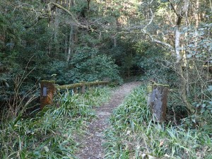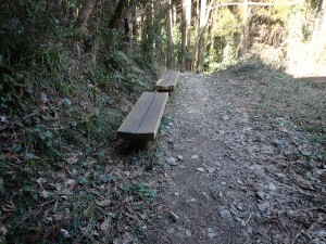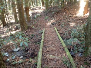 | 木橋を渡る | 土砂崩れした場所 | ベンチがある |