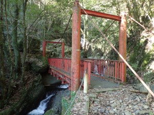 | 樹林帯を進む | 沢を渡渉する(ロープがある) | 赤い橋は健在(9:30) |