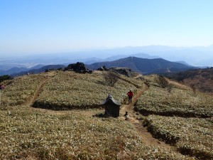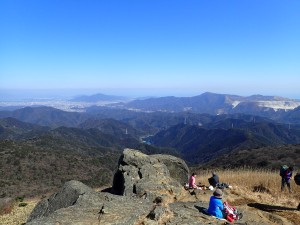 | 遠くに足立山、手前は貫山・平尾台 | 山頂は賑やか(11:55) | 上野への道が見える |