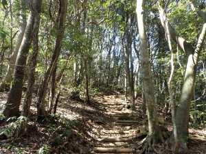 | 灌木帯の登山道 | 樹林帯になる | 丸太の階段 |