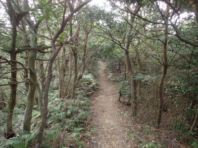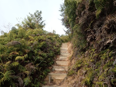 登山口から予定通り、展望台へと進む。シダの茂る道は明るく開けていて眺めも良い。