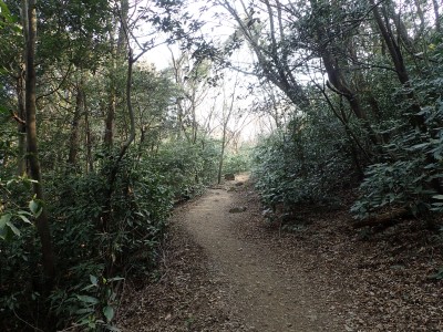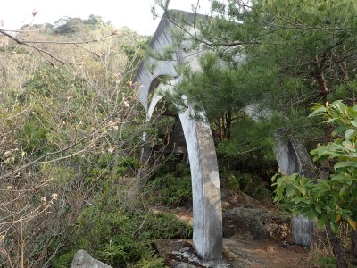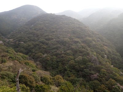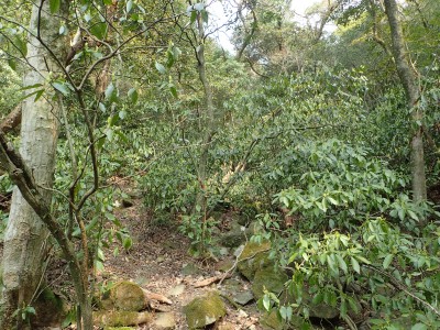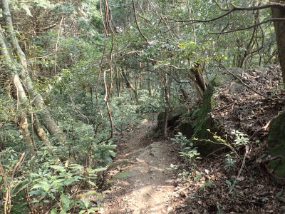 一旦降りて先に進もうとすると目の前に「弘法岩」と書かれた表示がある。下を見ると何やら案内板のようなものが見えたので少し降るとすぐに巨石がある。何度も訪れた福智山だが、初めて知る名所である。なかなか面白い。登山道は一旦林道に出て林道に沿って再び登山道となるが、途中でショートカットできそうな道があったので地図を確認しながらアオキの茂る急斜面を登り切る。上野越から鷹取山への登山道に出ると鷹取山へと向かう。鷹取山の頂上はスイセンがたくさん咲ききれいだ。しかし、元々の山野草はどうなったんだろうと心配になる。