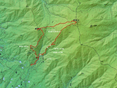 駐車場-(10分)-登山口-(10分)-展望台-(10分)-林道-(45分)-鷹取山-(8分)-上野越−(45分)-山頂−(50分)−林道−(40分)−登山口−(8分)−駐車場 ※休憩含まず。全行程で5時間でした。 距離8.6.km 標高差747m |