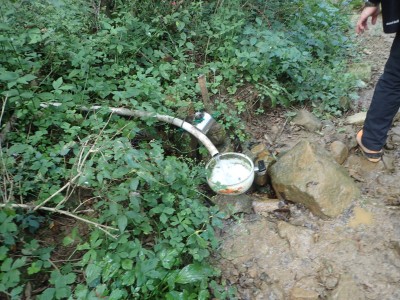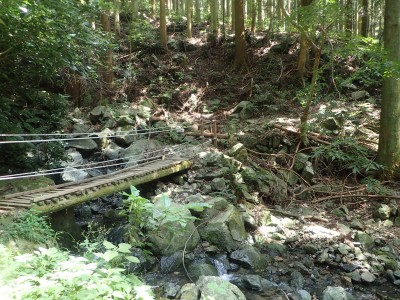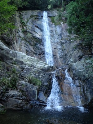 薄暗い沢沿いの岩場道を少し歩くと赤い鉄橋があってその先に滝がある。落差25mらしい。
