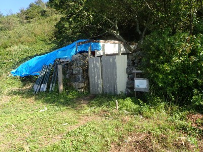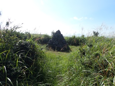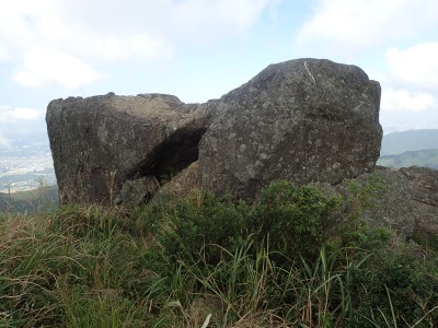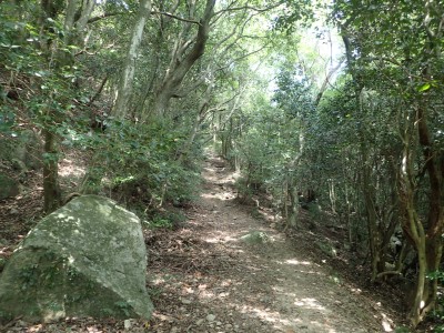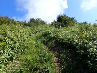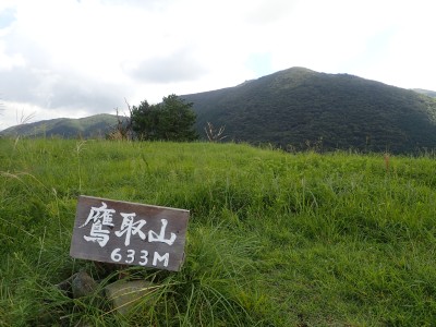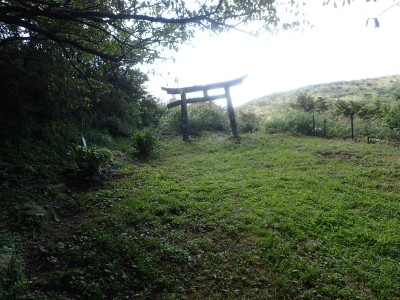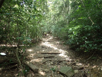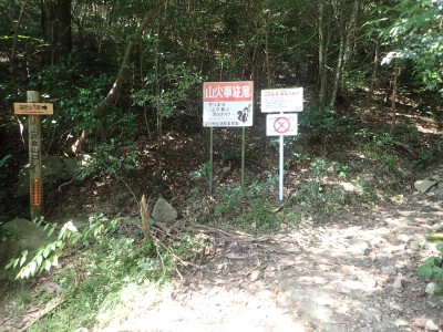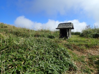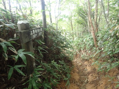 滝の左手より急斜面の登山道が続く。一気に登ると登山口からの道と合流する。ここから八丁越へと尾根道を急登する。森林を抜けて開けると福智山の頂上部が見えてくる。振り返ると鷹取山の頂上を見下ろせる。ケルンを見て通常なら真っ直ぐ進むところだが、右に鳥居を目指す。あまり人が歩かない道のはずだが、はっきりしている。小屋跡の先に鳥居があって手前に水場がある。そこから急登して頂上に着く。山頂は、涼しくて気持ち良い。時間も早かったようで先客は3組程度だ。