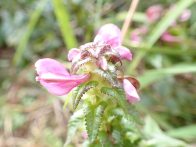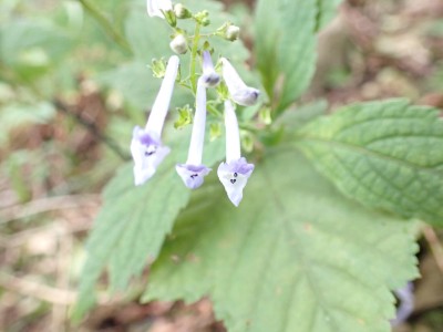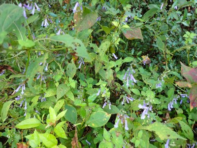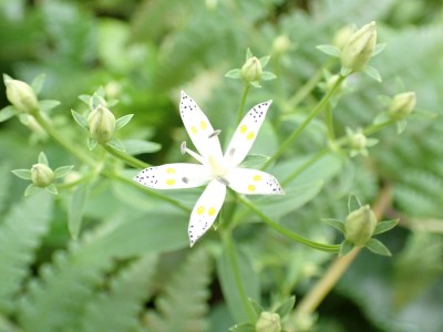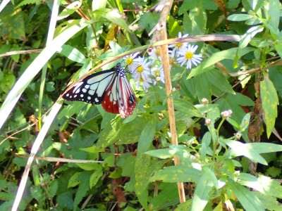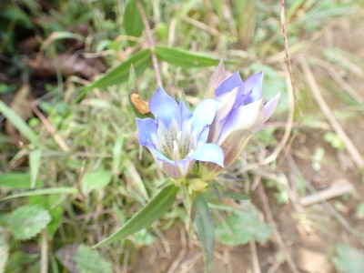烏落で広がっていた青空はガスがかかりすきっとしないがそれでも眺めを楽しみながらのランチタイムだ。下山は鈴ケ岩屋へ立ち寄り自然歩道を降る。ちょうど勧誘した若い女性と一緒になった。決して計画的ではないのであしからず。降りきるとツルリンドウやシオガマギクが咲いていてアサキマダラがフワフワと飛んでいた。鈴ケ岩分岐でその女性とは別れた。鈴ケ岩屋から福智山頂上部を見て後は自然歩道を下り、無事鱒渕ダム堰堤に。朝ご一緒した男性の車は未だあったのでおそらく尺岳から福智山へと縦走したのだろう。今日も山に自然に感謝!!