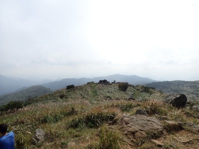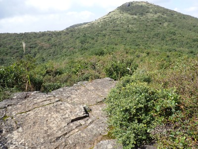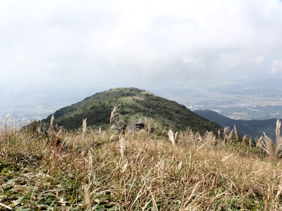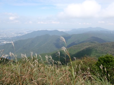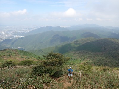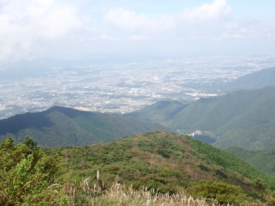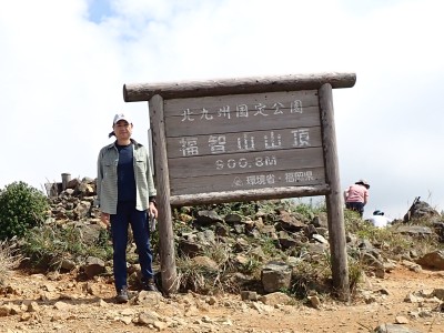 快適な縦走路をのんびりと歩き、烏落に到着。青空が広がっていたので嬉しくなる。ここから少々つらい登りが始まる。登山者は急に増えて降る人とのすれ違いが増える。荒宿荘を過ぎてしばらくすると視界が開ける。皿倉山や直方方面の町並みが見渡せる。大きな岩が頭上に見えてくると賑やかな子供の声がする。岩の上ではしゃいでいるようだ。山頂はすぐだ。