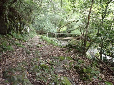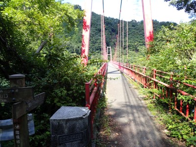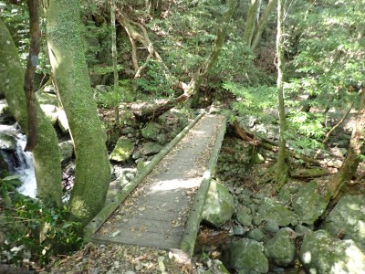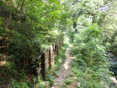 ダム湖の堰堤を歩き、ゲートを抜けて舗装道を歩く。涼しくて気持ちよい。赤い橋を左に見てそのままダム湖の縁を進む。登山口で一休みしていると後ろから福岡から来られたという男性が追いついてきた。尺岳へ行くというので山瀬別れまで話をしながら一緒に歩くことになった。七つの滝は、写真で見るよりもっと大きい。七の滝は15mも落差があるのに写真だと3mくらいにしか見えない。