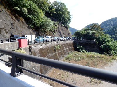 鱒渕ダムの堰堤付近に車を停めるが、既にたくさんの車が駐車し、登山準備をしている人もいる。