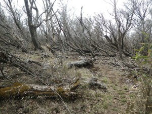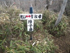 | 強風のためか斜めに倒れて枯れた木がたくさんある | 古祖母山山頂にある分岐標識 | 古祖母山頂上にて |