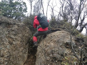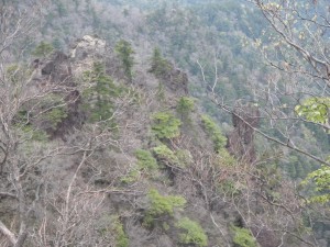 | 祖母山を背に | 岩場を降る | こんな岩峰が多い |