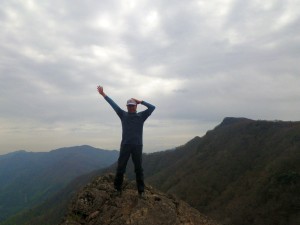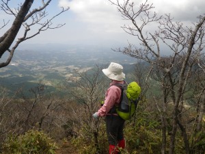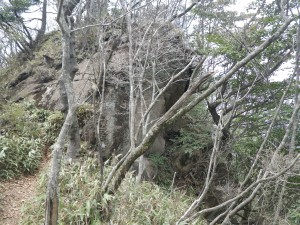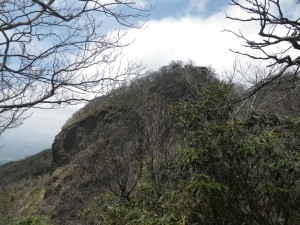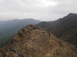 | 前ページから 黒岳分岐からすぐに親父山頂上に出る。山頂からはこれから歩く障子岳から古祖母山への稜線が見渡せる。雨がまともに当たるためここで雨具の上だけ着ることにした。気温が高いので中はTシャツ1枚で十分だ。頂上で着替えをしていると女性2名が登頂してきた。下見云々ということのようで山の会のことなんだろう。今から自分たちは、古祖母へ行くと言ったら、山頂で同じメンバーの○○さんに会ったら「私たちは周遊するので古祖母山へは行かない」と伝えて欲しいと伝言を頼まれた。結局、古祖母では誰もいなかったので伝えることはできなかった。親父山から障子岳へは、一旦降り、上り返すが、大した落差ではない感じだ。途中でB29が墜落した場所があるが、私はB29というと爆弾を投下した敵軍が打ち落とされて墜落したものと思っていたが、この時は救援物資を運んでいたが濃霧と雨で尾根にぶつかって墜落したそうだ。説明板を読んで初めてわかった。道は左に巻くように進む。出迎えてくれたように両脇にコバイケソウが葉を広げている。見晴らしがよくなって午前8時40分障子岳山頂に着く。360度の展望で形の良い祖母山が良く見える。一息ついて古祖母山を目指す。岩場を降るが、祖母山側には、天狗岩や烏帽子岩の奇峰が見える。次回はこの尾根を歩いてみたいものだ。岩場を慎重に下り、岩のヤセ尾根に出るがここで何とマンサクの花が咲いていた。シャクナゲが未だ咲いていないのは当たり前だ。左手に岩壁を見ながら降って行くと土呂久との分岐に出て通り過ぎる。左側が切れ落ちた道となって下りきると広い場所に出た。そこには第一展望台と書かれているので帰りに寄る事にする。ここからは、スズタケの多い平坦な道となり上りになると枯れた木がたくさんある異様な場所を通過する。上りがきつくなって午前9時45分古祖母山頂上に飛び出る。テーブル状の岩に立つと西側の展望が良い。しばらく伝言を頼まれていたので休憩をするが、昼食の時間には未だ早いので折り返しで来た道を戻る。青空の障子岳が時々見えて雨が上がったので雨具を脱いで歩く。ついてる私たちは改めて「ついてる」と言い合う。第一展望台に立ち寄りランチタイムだ。風が強いので岩場から引っ込んだ木のところで展望と粗食を楽しんだ。尾根歩き、岩場をクリアして障子岳に着いたのは午前11時25分だった。障子岳では、6名くらいのパーティが登って来た。空はすっかり晴れ渡り眺めは最高である。親父山からすぐに黒岳へと進む。巨木が多いということは、この辺りは原生林なのだろう。下りきると目の前にもっこりとピークがある。ちょと早いがあれが山頂かと足も軽くなる。近づくと目の前に岩壁が立ちはだかる。左に巻いてロープ場を登りつめると縦走路に出るが山頂ではなかった。もうひとつ先のピークかとも思ったが、もう騙されない。たぶんまだ先だ。狭い岩の隙間をよじ登ってシャクナゲの群生地を行くと北谷登山口との出会いの道標がある。今度は山頂だ。ロープ場の急斜面をよじ登ると一旦少しだけ下って黒岳山頂に12時30分、ようやく着いた。展望台とあるので覗くと高千穂の街が見える。次は三尖だ。何と読むのかわからないまま先を行く。急斜面を下って振り返ると今いたのが絶壁だったというのがわかる。ここからも何度もピークがあってまだかまだかと疲れもピークになってくるが、三尖は意外にも登山道脇にポツンと表示がある。(午後1時30分)写真をとって疲れたが先に進む。もう一度ピークを乗り越えると後は下りだ。スズタケの道からブナ林の斜面を抜け、再びスズタケを抜け植林帯を右に見てスズタケの道を下って行くと林道が見えてきた。午後2時10分林道に出て左を見ると無事車もあってほっとする。登山口には障子岳でお会いしたグループがちょうど降りてきた。いやー本当にハードだった。 ■コースタイム 親父山登山口−(90分)−親父山−(25分)-障子岳−(60分)−古祖母山−(35分)−第一展望台-(35分)−障子岳−(25分)−親父山(35分)−黒岳−(55分)−三尖−(45分)−親父山登山口※休憩時間は含んでいません。全行程で約7.5時間かかりました。 ■おまけ 帰路に竜ケ岩滝を見て高速道の渋滞を予想して高森町から九重を抜けることにした。途中道の駅に立ち寄り、家内との約束の温泉は産山村の温泉に立ち寄った。何とハウスを改造した面白い温泉で入浴料は400円とリーズナブルで露天風呂もあった。 ■三尖 「みつとぎり」と呼ぶらしい。確かにピークが三つあった気がした。 |