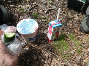 | 展望台から東側にある奇岩 | 遠くに昨日歩いた大障子 | 昼食は質素 |