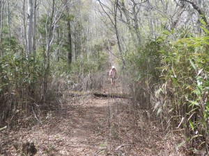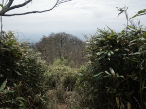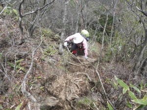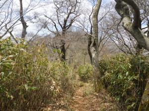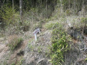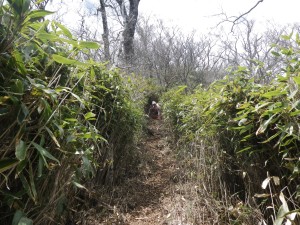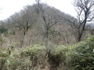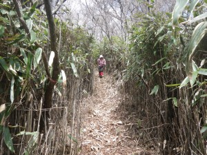 | 一気に高度を下げた | 植林帯の先に林道が見えるが | 再び笹の中を歩く |