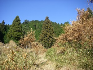 | 杉の植林帯を歩く | 開けたが・・・・ | 登山道を見失う |