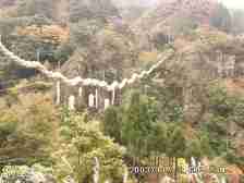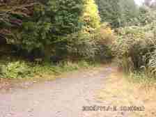 | 林道(途中まで舗装されてい.る) | 今回のコース 今回は、そう言う理由で登頂を断念しました。せっかく来たから紅葉でも楽しもうと穴場と言われいる「深倉峡」に向かうことにしました。荒れた道を不安ながら進みやがて紅葉と奇妙な岩が心を和ませ、登山口から約6Km程度行くといきなり舗装されたきれいな道に出ます。そこは観光のため整備されていて巨大な七五三縄(しめなわ)が道路の上に岩と岩をつなぎ現れます。おもわず「なんじゃこら!?」と口に出てしまいました。 |