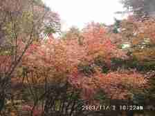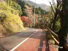 2003/11/2 天気 曇り 英彦山の南西に位置する岩山「岳滅鬼山」に紅葉を楽しもうと天気のはっきりしない中、天気予報の「晴れ」を信じて出発した2人でしたが、荒れた林道を不安げに車を走らせようやく登山口に着き、降りたとたん、かみさんが震えながら「いやー私行かない!!」と足元を見ると巨大な(30cmぐらい)ミミズが、そこらじゅうにうじょうじょしていたのです。私は「ミミズごときで、ここまで来て、登らないとは困ったもんだ」と言いましたが、確かに足の踏み場もないぐらいの異常な光景で、あとから思うとやっぱり行かなくて良かったような気がします。たかがミミズといえどもこんなに発生しているのは、何か不吉なことが・・・・・ いずれにしろ今日は諦めて深倉峡に立ち寄ることにしました。 ところが・・・・・ この林道はかなり荒れていて車高がある四輪駆動でないと危険です。 それでも後へ引けず、ゆっくりゆっくりと進みました。 紅葉と奇怪な岩に和まされて、ようやく舗装された車道に出ました。 |