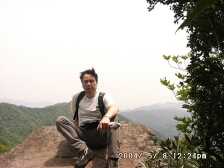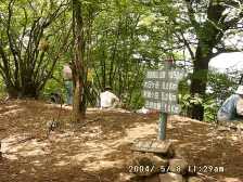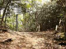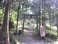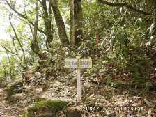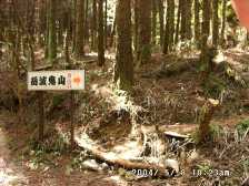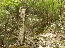 | 玉屋神社参道入り口 | 何度か自然林と植林を行き、出発から約50分で大南林道にでます。(写真)ここに5〜6台車が止めてありました。(よくも悪路を来たものです)ここに大きな標識がありますので標識に従い斜め左に林道を進みます。右手に小屋が2棟見えてきます。その先に分岐した林道がありますが、まっすぐ進み、登山口の大きな標識ありますのでここから山道となります。杉林の急坂を行くと支尾根にでます。杉林から急に開けるとさらに急な坂になります。 ここでの鳥のさえずりはすばらしく鳥見も良いかもしれません。しばらく緩やかな上りを行くと岳滅鬼峠に着きます。ここには昔の藩境石「従是北豊前国小倉領」があります。左に10mほど行くと展望所と標識に書かれていましたが、木が茂り視界があまり開けてませんでした。ここから急登です。まず一つ目のピークは梯子を超えると巨岩があり展望が開けます。一旦急降下し、さらに急登し、2番目のピークを超え再び下り、このコース一番の難所3番目のピークへと這い上がるようにしてあがると山頂らしきところ(写真)にでますが、山頂はこの先にあります。下山は往路となります。 |