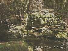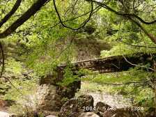 今回のコース 英彦山大権現の駐車場から林道を少し(7〜8分)歩くと左手に「玉屋神社」の参道入り口があります。(玉屋神社は当ホームページの「英彦山」で紹介しています)右手に朽ちた木の大きな橋があります。その下の沢を横断します。わかりづらいですが手前の木にテープが貼っていますから目印になるかと思います。沢を渡り少し行くと(しっかり踏み後がある)右手に再び朽ちた木の橋があります。渡らずに左手に進むとこれまた朽ちた建物があります。(ここは以前キャンプ場だったそうです。)右手に進み杉林の緩やかな坂を上っていきます。杉林を一旦抜け沢を横切り再び沢沿いに進み、背丈より大きな岩の間を抜け、再び杉林を、上りきると一旦平坦になり右下を沢にして杉林を抜け緩やかな上りを行くと沢にぶつかります。(写真)沢を横断し、積み石の上にあがり、すぐに左手に(テープを目印に)杉林を進みます。(途中、木が倒れたりしていますがとにかく踏み後とテープを目印にすれば迷うことはありません。) |