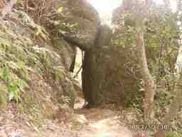 平成15年3月30日 天気晴れ 今日は浜ちゃんと家内と3人で低山ではありますが桜の名所ということもあり 花見もかねて岩石山に行くことになりました。 田川郡添田町(英彦山に近い)に桜の有名な添田公園があります。 その添田公園を麓にしているのが岩石山(がんじゃくさん)です。 岩石山は、その名のとおり大きな岩が多く山頂には平安時代(1158年) に岩石山城が築かれたそうで柱の跡(柱穴)や古井戸、石垣が見られます。 また山頂は樹林の中で現在は展望台が作られています。そこからすぐに国 見岩という巨大なしかもその上からの展望はすばらしく、また大砲岩や八畳 岩と変わった形の岩が点在しています。 |