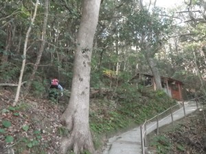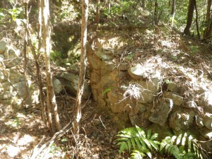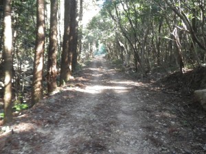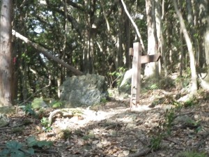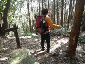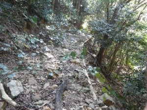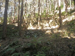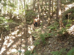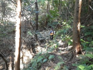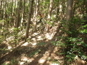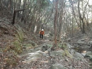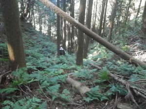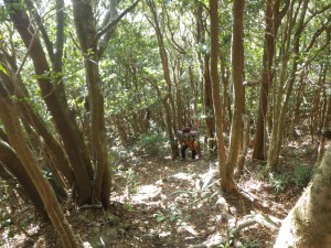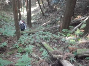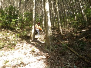 | 30m〜50m程度くらい降る | 登山道らしき道に出会う(12:25) | 炭焼き跡だ |
