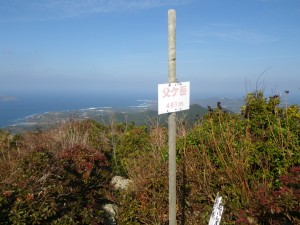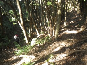 | 前ページより ロープがかかっている急登を喘いで登りきると絶景が待っていた。いやー素晴らしい眺めである。360度見渡せる。七ツ岳からここまで歩いて来た稜線も昨日歩いた大瀬山もそして高浜の白い砂と波打際の白から藍色に変化するグラデーションはさすが日本一美しい海水浴場と言われるはずである。七ツ岳の頂上からはこの広大な海をまじかに見ることができなかったので本当にここまで来て良かったと思う。 眺めを堪能しながらここで昼食をとる。ここまで3時間40分かけてきたが帰路はまともな登山道ではないなのでもっと時間がかかるかもしれない。 下山は、急斜面を戻り、頓泊の分岐も通過し、道が切れて窪んだ場所まで戻る。そこから西に適当に降る。おおよそ標高差30m程度だと思うが登山道らしき道が山腹を巻くように伸びていたので南に向け歩く。ところどころ踏み跡が消えているが、炭焼き跡などもあって沢沿いになるので間違いなくこのまま進めば林道に出るはずである。(地図を見て) ところが作業道らしき所でツル性の植物が蔓延って進路を妨げる。しばらく格闘しながら何とか抜けると林道に出る。家内もかなり疲れたようだ。 林道に出るとルンルン気分で七嶽神社の分岐を過ぎ、目の前が開けてくると七ツ岳の鋸歯が見えてきた。七ツ岳はここから見るのが一番だろう。 予定通り車道から林道に入り、沢沿いにしばらく七ツ岳を見ながらひたすら歩く。林道がはっきりしない道になってもそのまま真っ直ぐ沢を詰めて歩く。もう道が無いのでとにかく歩きやすいところを選んで歩く。少々サバイバルだが、面白い。沢を登りつめると尾根に出てそのまま少し登り返すと今朝登山口から歩いた尾根とぶつかる。そこから適当に降るとちょうど草づみ地蔵の門の手前に出た。バンザーイ! 時計を見ると何と14時6分。父ケ岳頂上から約2時間で降りてきたことになる。せっかくだからこれを周回コースとして整備されてはどうであろう。色々と柵(しがらみ)はあるだろうが・・・・。 さて時間は未だ早いのでもう一座と言いたいところだが、「もう歩けん。きつかー」(なぜか博多弁)と口には出さないが、家内のために?温泉に行こうと決め、近くでもある有名な荒川温泉に立ち寄ることにした。 入浴後、福江港付近まで戻り、五島観光歴史資料館を見学した後、ガソリン満タンでレンタカーを返却して福江空港まで送ってもらう。 空港では、フライトまでレストランで夕焼けを眺めながらビールを飲み二人で反省会だ。その後、博多駅でバタバタと食事をして無事帰宅した。 最後に妻の感想は 「七ツ岳は最高だった。なぜ?って 岩のヤセ尾根はスリルがあって面白かった。でも怖いからもう行かない。父ケ岳へのルートは長かったけど最後の登りは一番きつかった。でもすごく良かった。」・・・・・とのこと ちょっと意味がわかりにくい部分があるが、ま、行って良かったと言う事だ。 とにかくこの二日間、自然に山にそして地元の人に感謝!! <コースタイム> 七ツ岳口-(60分)-七ツ岳-(70分)-寺脇分岐-(65分)-頓泊分岐-(20分)-父ケ岳-(8分)-頓泊分岐-(10分)-窪んだ場所-(8分)-登山道-(10分)-荒れた作業道-(20分)-林道-(9分)-七嶽神社分岐-(7分)-舗装道と林道の分岐-(55分)-七ツ岳口※休憩時間含まず。全行程で約6時間でした。 |
