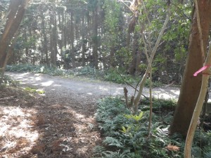 | 鎖で車輌は通行止め | 林道に出会う(12:54) | 神社は左だが今回はパス(13:03) |