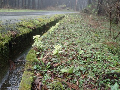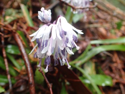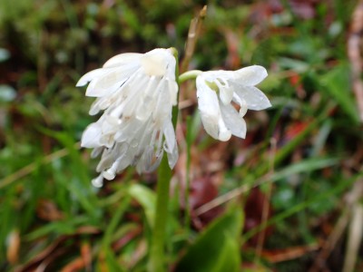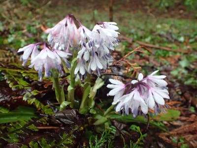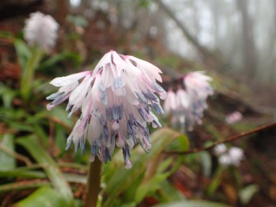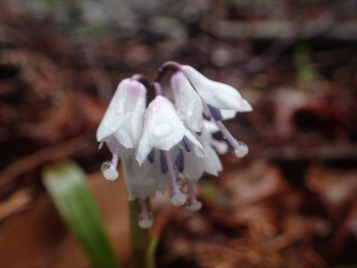 コロナ禍の間は雨天中止を基本としていたが、午前9時頃には雨はやんでくれそうなので決行することにした。当日、小雨の降る中、集合場所から出発。九州道から都市高速へそして前原I.Cで降りて一般道を走る。雨はあがったかのように思えたが、山に入ると再び降り出した。白糸の滝駐車場に着いてまずは滝の見学。そして予定のコースを変えて舗装道を羽金山まで傘をさして歩くことにした。本来ならデッカ橋から登山道に入るが、そこは通り過ぎ、舗装道をひたすら歩く。期待していたショウジョウバカマの花は、終わった株もあれば、見頃の株もある。飽きるはずの舗装道歩きは仲間同士の弾む会話と可愛い花のおかげで目的地の羽金山入り口まで辿り着いた。