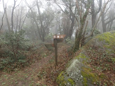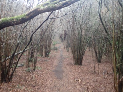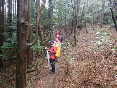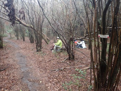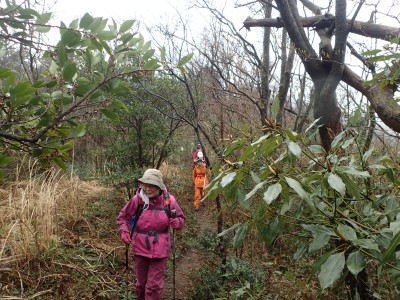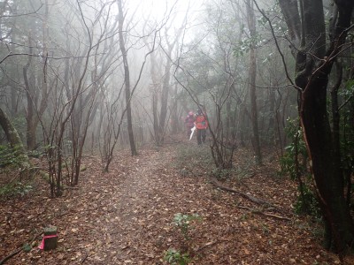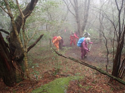 幸い、雨はやみ、ガスに覆われた登山道を傘をたたんで歩くことができる。急斜面をズルズルと降りアブラチャンの平坦な場所に出ると予定通りここでランチタイムとする。