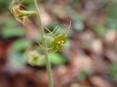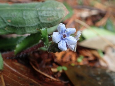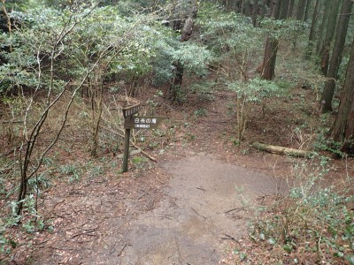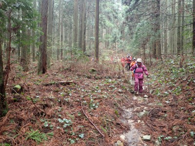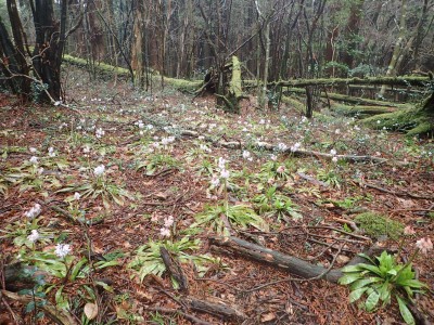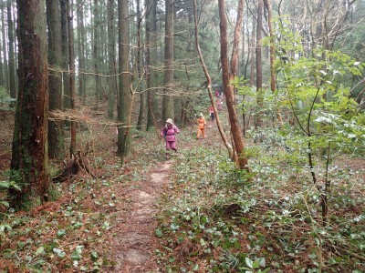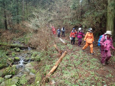 昼食を終え、河童山へと登る。標高差は50mほどだ。相変わらずショウジョウバカマの花が賑やかに地面を独占している。河童山への分岐からすぐに山頂だがヤブで覆われているので分岐まで戻って集合写真を撮る。ここからは緩やかな下りだ。明るい道がしばらく続くと杉林の中へと入り込む。荒川峠との分岐点から右(北)へ進路をとり、デッカ橋まで沢沿いに降る。後は往路を戻る。