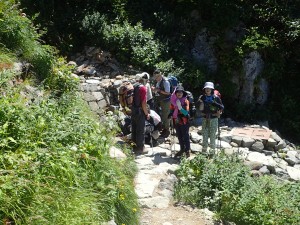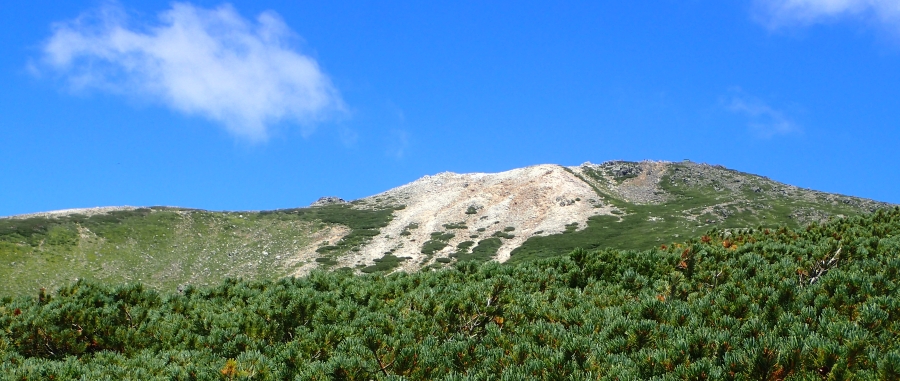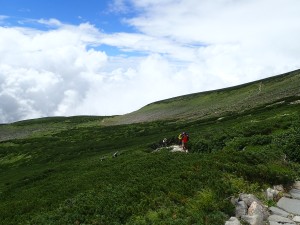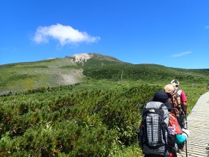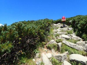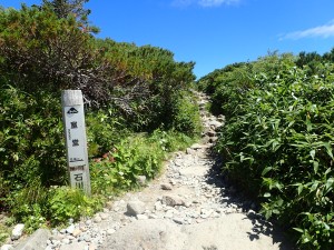| 御前峰を見ながら木道を歩く | 上りはゴロゴロした石の道 | ハイマツ帯を行く |