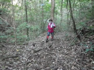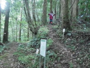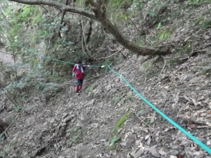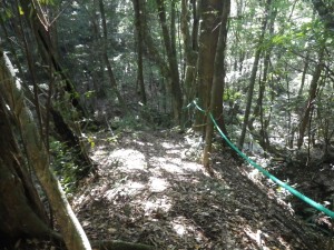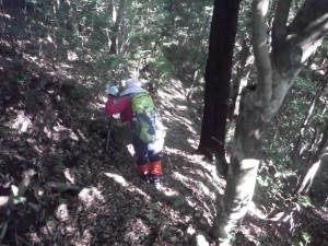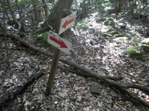 | 尾根ルートとの分岐、滝ルートへ(14:34) | 道標がある | 急斜面を降る |