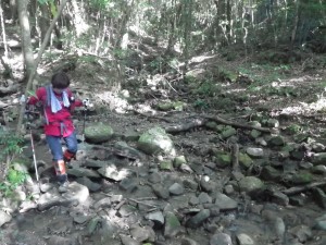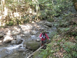 | 苔が多い | 滝コースとの分岐、尾根コースへ(12:02) | 川を渡渉する |