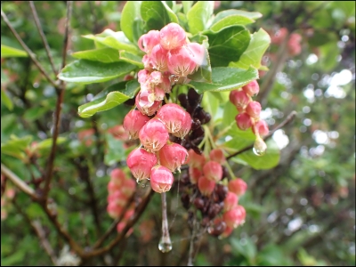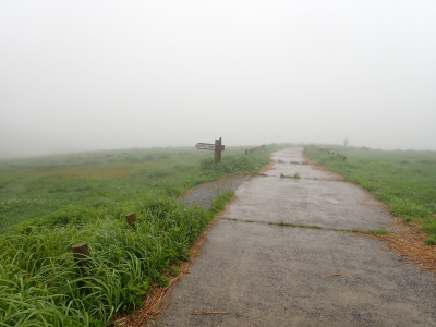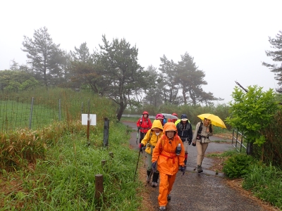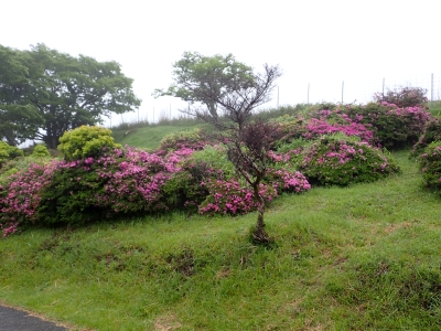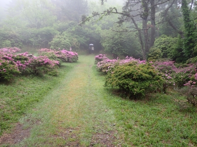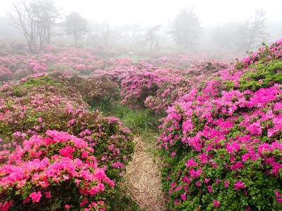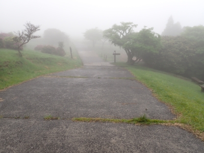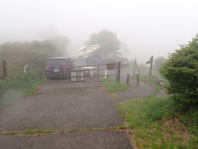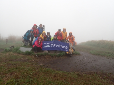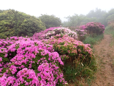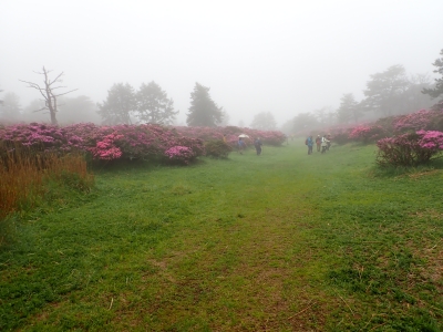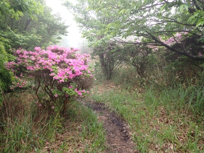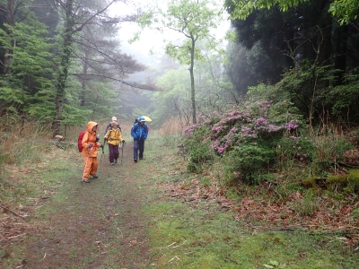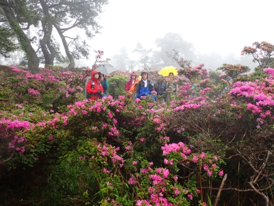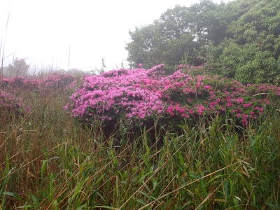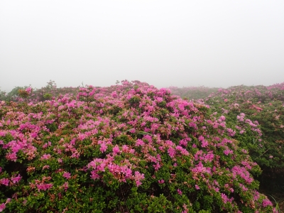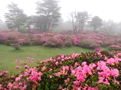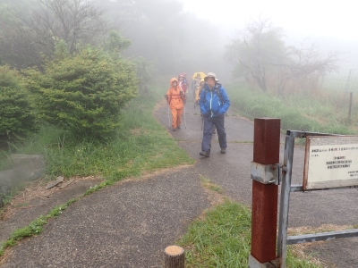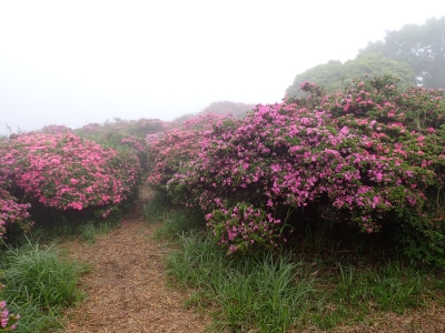 雨模様で肌寒い、それでも駐車場は満車状態。いつもの山行よりも30分早く出たおかげで3台で乗合いした車は駐車することができた。駐車場で登山準備をしている間に続々と登山者の車がやってきてあっという間に満車になった。霧雨の中、登山口には協力金を回収する方が小さなテント下で立っていた。先週は山開きだったのでこのことは知っていたが、今日も回収されるとは思ってなかったためザックから財布を取り出し、「11人となると結構な額になるなあ」と思いながら。全員分を立替えた。視界の効かない道を歩き避難小屋の先から砂利道の林道へ。そして「お花畑」の標識より暗くて細い荒れた舗装道を進む。開けた広い道に出てミヤマキリシマの群生地に着く。ガスの中、遠くまではっきりと見えないが、近づけば水滴を身にまとった瑞々しい花を目にする。ゆっくりと群生地を楽しみながら再び細い道から林道に出て鼻ぐり登山口につく。ここも以前はなかった駐車場が満車を超えて係の人が誘導していた。仮設トイレを借りて鼻繰登山口から急坂を登る。鼻ぐり岩を通りすぎ、岩の上が展望所だが、今日は真っ白で何も見えない。登り切ると逆回りの団体さんとすれ違う。青空が広がることを期待しながら平坦な道をミヤマキリシマの花を見ながら歩く。展望が開けてるはずの場所を何度も通りすぎる。頂上が見えてきたが霧雨が小雨に変わってきたのでここでのランチは諦めて集合写真を撮ったらすぐに下山。避難小屋に着くと霧雨も止んだのでベンチでランチタイム。幸い、食べ終わるまで雨は止んでくれた。ここからは往路を戻るが、せっかくなのでミヤマキリシマの群生地に立ち寄る。ガスでよく見えない道なので観光客は迷うかも知れない。結局、駐車場についても霧雨は強くなったりして青空を見ることはなかったが、雨のおかげで瑞々しいミヤマキリシマの花が見れた。今日も自然に山に仲間に感謝!!