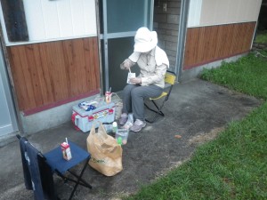 | 小屋前で朝食 | ||