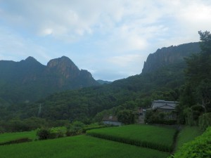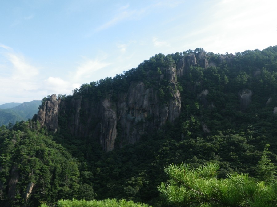 2012年8月12日(日) 天気 晴れのち曇り ■出発時間:午前6時20分(丹助小屋) ■メンバー:家内と私の2人 丹助小屋での宿泊は電気も水もない不便な一夜ではあったが、清潔で電灯が点かないおかげで虫も寄ってこなく快適に過ごせた。朝食を済ませたら、清掃して戸締りをして小屋を後にして比叡山の登山口に移動する。 7時00分、比叡山の千畳敷登山口に車を停める。今日も私たちだけか、他に車はない。北九州を出発する時にネットで見た天気予報とは違っていて青空が広がっている。来て良かったと何度も家内とうなずき合う。登山口の案内板を見ると比叡山の位置がガイドブックと違う。ガイドブックでは比叡山は918mのピーク、案内板では稗ノ山となっていて760mのピークが比叡山になっている。よくわからないが、ま、とにかく歩こう。 7時14分、登山口を出発してほんの3分程度でテーブル状の岩が広がる千畳敷展望所に出る。正面には昨日登った矢筈岳の岩峰が目の前に見える。しばらく展望を愉しんで先を行く。比叡山山頂への案内板を見ると、ここから急斜面の本格的な登山道となる。樹林帯の中は、暗く湿度も高い。石の上や木の根は滑りやすいので注意だ。 7時45分、岩壁が見える場所に出た。鋭く上に尖った岩がある。説明板にニードルとある。確かに針のような岩だ。急斜面は続く。暑さのせいかとにかくきつい登りである。 ようやく空が見えてくるとホッとする。 8時10分、比叡山の石柱が立っている一峰に着く。展望は抜群で目の前は二峰の岩肌がすごいの一言。矢筈岳や丹助岳も良く見える。ここでしばらく休憩をして出発する。稜線の登山道は再び樹林帯となり緩やかに登ると大きな岩にぶつかる。ここが山頂への分岐で山頂まで100mとある。まずは左に進み山頂目指す。 8時50分、分岐からすぐに比叡山頂上に着く。大きな岩に登れば展望を望めるが、下からでは展望はない。ここに「なぜこのピークを比叡山頂上としたか」の説明板があった。と言うことはやはりガイドブックの918mのピークが以前は山頂になっていたようだ。往路を分岐まで戻り、カランコロ岩を目指す。尾根は、岩が多くなり、見晴らしが良い場所もある。明るい樹林帯は気持ちも明るくなるから面白い。アップダウンはあるものの高度は上げて行くのできつい。 9時28分、カランコロン岩への道と下山道の分岐に着く。真っ直ぐカランコロン岩を目指す。すぐに岩の間に梯子が見えてきた。ストックをしまって狭い隙間を行く。登りきるとテーブル状の岩に立つ。その上部にカランコロン岩と表示があってロープが掛けられている。これを使ってさらに登ると360度の展望だ。カメラは家内に持たせ自分を撮ってもらっているので私の手にはない。それを忘れていてここからの展望を写すことができなかった。残念。ここでゆっくりとしようと思ったが、やっぱり暑い。すぐに撤退だ。テーブル状の岩をロープを使い降ると下山道と合流する。樹林帯の中に入ると少し降り、鞍部のような場所で小休憩。朝食があまり食べれなかったのでパンをかじる。水はペットボトル3本ずつ持ってきたが、結構ぎりぎりかもしれない。休憩を済ませ樹林帯の尾根道を歩く。登りがとにかくきつい。大きな岩屋を過ぎ明るくなってくると山頂は近い。 10時20分、稗ノ山頂上に着く。展望はほとんどない。証拠写真?を撮って下山開始。帰路は往路を戻るがカランコロン岩の手前から下山道を降って上り返す。ここで本日と言うか今回初めての登山者が反対から登って来た。どうやらご夫婦のようだ。合流点に出ると往路を再び戻る。一峰まではすんなり戻ったが、ここからの降りは以外に梃子摺る。何しろ木の根と岩が道の面積のほとんどを占めているため足運びが大変だ。特に降りは、ちょっと気を緩めると滑ってしまう。疲れはピークを達し何度も休む。家内はと言うと、昨日はかなり疲れていたが、今日は私の方が参っている様だ。どうも昨夜飲み過ぎたせいのようである。後悔すれど昨日のビールと日本酒は最高だった。 12時36分、無事何とか登山口に着く。岩から流れ落ちる清水を頭からかぶり、顔を洗うと生き返るようだ。(死んではないが・・・・)駐車場には私と山口ナンバーの車が停まっていた。おそらく先ほどすれ違った登山者の方であろう。汗だくで腹も減ったので計画通り、遠回りだが日之影温泉で入浴と食事をすることにした。もちろん風呂から出たらノンアルコールビールで喉を潤すのだ。風呂から出ると比叡山ですれ違ったご夫婦らしき登山者が、ここに来られている。既に着替えを済ませた私たちには気づかないようなので声もかけなかった。レストランでは、夫婦仲良く?特性チャンポンを食べる。その量は私の胃袋を満杯にした。家内はどうかわからないが・・・・・。 この二日間、本当に暑さで疲れたが、天候を心配し、来ること自体を躊躇したが、本当に来て良かった。今日も山に自然に感謝である。それに小屋の管理人さんにも