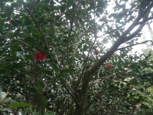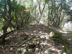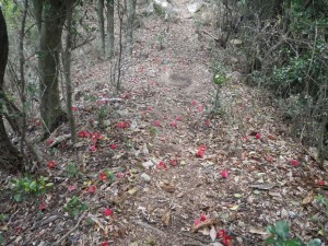 | またまたツバキの花びらの絨毯 | 結構花が付いている | 山頂が見える |