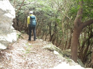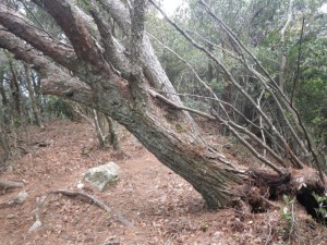 | 大きな赤松が倒れている | 狭い尾根道を歩く | 露岩も多い |