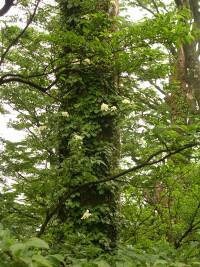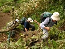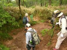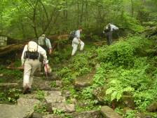 2006年6月18日 天気 曇りのち晴れ 遊山歩会は、昨日の「長野山(山口県)ササユリ観賞登山」に引き続き、今日はオオヤマレンゲを見に英彦山に行くことになりました。リーダーのMORIさんが下見をしてくれていたおかげで見事に開花したオオヤマレンゲを見ることができました。また、ヒコサンヒメシャラにも出会うことが出来ました。 AM9時00分高住神社に集合、参加者は、MORIさん夫婦、KFさん、シュー左衛門さん、がしんさんそれと私たち夫婦の総勢7名です。 <アクセス> 英彦山駅を過ぎ天狗ライン〜別所駐車場〜高住神社 <今回のコース> 高住神社より北岳を目指します。階段から石段になり望雲台を過ぎ急登を喘ぎます。 木製の階段を駆け上がると山頂(中岳)まで1.1kmの標識がある鞍部に出ます。 神社から約50分です。南側の自然林を楽しみ木の根をつかんで一上りすると北岳に着きます。標識のあった鞍部から約20分です。 北岳で記念撮影と休憩をしたら中岳を目指します。なだらかな道から岩場となり急登を行くと山頂です。今日はガスが出ていて展望はだめでしたが、晴れていれば南側の展望が望めます。今日は団体の方が来ていてたくさんの人で賑わっていました。昼食を済ませ、記念撮影をして下山開始です。下山は行者堂経由でバードラインを行きます。 石段を下り15分で行者堂です。さらに下り、開銭跡を過ぎ山頂から約30分で「バードライン、スキー場経由、英彦山青年の家」と書かれた標識がある分岐点に着きます。 ここより下ります。結構急な道なので注意です。途中右手に「福岡県英彦山野鳥の森」と書かれた休憩所があります。ここから下ることができます。(この先に標識があるとのこと)英彦山を時計回りに巻くようになだらかな道を下ります。ところどころに「観察路」と書かれた標識があります。なだらかな道から急な下りとなり岩場を行き急に開けるとスキー場です。山頂から約75分です。次ページへ |
