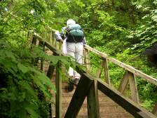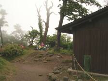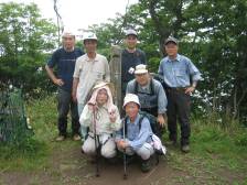 | 木の階段をあがると鞍部 | 鞍部標識 | みんなで撮影 |