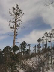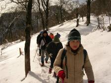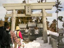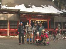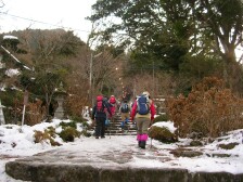 2006年1月3日 天気 晴れ MORIさんを中心とした「遊山歩」の会の平成18年度新年例会は「英彦山」になりました。私にとっては2度目の雪の英彦山です。 初めて雪の英彦山に来たのはちょうど10年前の平成8年の1月3日でした。未だ登山を始める前で子供たちは長男が中1で長女が小学生でした。お参りのついでにちょっと歩こうということで普段着のまま(もちろん靴も普通のスニーカー)しかも午後2時ごろだったと思います。滑りながらも子供たちは雪で戯れていました。鎖場は凍っていて一番下の娘が泣きながらよじ登った記憶があります。4時ごろ既に薄暗くなってしまったので途中で(開銭跡あたり)引き返しましたが、今から考えるとかなりおそろしいことをしたものだと思います。知らないと言うことは怖いものです。下山してくる登山者の人たちは私たちを無謀だときっと思っていたに違いありません。それでも「危ないよ」と声をかけてくれるおせっかいな人はいませんでした。だけど例えおせっかいと思われても教えてあげるべきですね。 さて今回は AM9時00分別所駐車場より、MORIさん夫婦とさこちゃん、UさんMさん、それと私たち夫婦の総勢7名での山行です。 「2000.10.20 友人たちと宴会」過去の日記 <アクセス> 英彦山駅を過ぎ天狗ライン〜別所駐車場 <今回のコース> 別所駐車場より舗装道を奉幣殿へ向う。みやげ物店を見て石段を上がりきると奉幣殿。 参拝をすませ、左手奥に登山口があるので石段を行く。20分程度で展望所につく。小休憩をしてさらに進むとやや平坦となりすぐに鎖場がある。凍結して滑りやすいので注意。 鎖場から5分程度で左手に少し戻るように道があり鳥居が見える。そこが中津宮。鳥居の奥のほうから中岳の上宮が見える。再び元の道に戻りしばらく雪と景色楽しみながら30分程度歩くと開銭跡※を過ぎ水場もある行者堂(むすび神社)に着く。次ページへ |