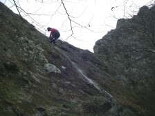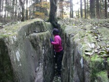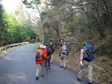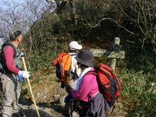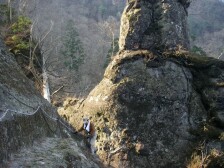 2007年12月2日 天気 晴れ 「自然観察とボランティアの山の会」の新年登山は英彦山を計画している。今日はその下見ということなのだが、CLの予定だったFさんが急用で本番当日来れないと言うことで急遽副代表のHさんがCLを務めることに。年末近いこともあり、下見の参加者も少なく男性3人、女性2人の5人での下見となった。下見ではバスの乗り入れとコースの選定が目的だが、5人なので途中で2班に分かれることにした。 ルートは別所駐車場より九州自然歩道を高住神社に向けて歩き、北岳を経由して中岳を目指す。下りで2組に分れ、1組は中岳より南岳を経て三呼峠、虚空蔵、奉幣殿と下り、もう1組は中岳からバードラインに入り奉幣殿に下り両組が合流するという予定だ。 別所駐車場を8時45分に出発する。 <アクセス> 英彦山駅を過ぎ、しゃくなげ荘へ向いそのまま500号線を進む <今回のコース> 別所駐車場より舗装道をしばらく歩くと九州自然歩道の看板があります。ここより登山道となります。車道を横断すると「英彦山山の家」に出ます。しばらく歩くとスキー場に出ます。別所駐車場から約35分です。さらに車道沿いに歩くと途中体育館が見えてきますので「針の耳」に立ち寄ります。体育館に向うと標識がありますので100mぐらい歩くと大きな岩の針の耳です。針の耳は清らかな心をもつものしか通ることができないそうです。しばらく遊んで再び元の山道に戻り高住神社を目指します。道は石畳の参道となり(この道は英彦山への峯入りの山伏の道でもあり耶馬溪への往来の生活道でもあったそうです)車道を横断すると石でできた太鼓橋に出ます。階段を上がると高住神社に出ます。別所駐車場から約70分です。ここまではほとんど平坦な道でしたがここからはひたすら上りです。石段を登り神社に出ると右手に登山口があります。奇岩を見ながら15分程度行くと望雲台との分岐です。ここで今回は望雲台に立ち寄ります。鎖場をよじ登きると目の前は切れ落ちていて右にトラバースします。すると右手に垂直な岩壁があり鎖があります。足をかけられるように削られているので苦労することなく登れます。岩壁の頂点には写真のようなポールと鎖がかけられています。足元は40〜50cm程度の幅しかないのでこれがなかったら大変です。次ページへ※針の耳は過去日記で詳しく紹介しています。 |