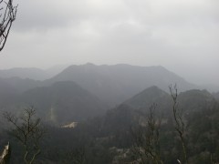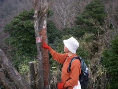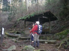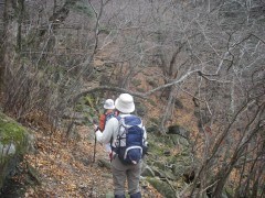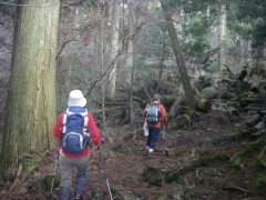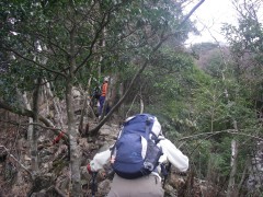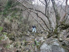2009年2月8日 天気 曇りのち晴れ MORIさんの御誘いで英彦山の未踏のコースを歩くことになった。 2月だというのに、雪はなく、冬らしくはないが、面白いルートということで楽しみだ。英彦山権現にAM8時45分に集合し、鬼杉登山口付近に車を停め出発。 <今回のコース> 鬼杉登山口から鬼杉を目指します。このルートは整備中のようで「資材運搬に協力」をと看板に書かれていました。鬼杉までは緩やかな上りです。鬼杉から南岳へと進みます。途中、籠水峠(こもりみずとうげ)との分岐がありますので右に進路をとります。南岳へ0.9kmの標識があるところです。苔むした岩がごろごろした緩やかな上り道をしばらく歩くと左に断崖絶壁の岩山が見えてきて正面は鞍部となっています。急登すると狭い鞍部でここが籠水峠です。これから左手の岩山に登頂するのですが、ロッククライミングはとてもこの体重では無理なので峠を一旦超えて下り、岩山をしばらく巻くと細い支尾根が取り付き地点となります。痩せた急登の道なので注意です。しばらく喘ぐと広い斜面となり左寄りに駆け上がると断崖絶壁の岩場に出ます。最先端にこわごわ行き、スリルと展望を楽しんだらそのまま稜線を東に歩くと「鹿の角」と書かれた札があるピークに着きます。誰が名付けたのかどうしてこの名前なのか、話は盛り上がります。ここからは中岳目指し、北に向かいます。けもの道のようで鹿の糞がたくさんあります。道は笹でおおわれ藪こぎ状態です。しばらく笹の中を行くと奇岩があって右に回り込むと苔むした岩場に出ます。急登をすると鬼の舌と書かれた小さな表示があって濡れた岩壁を三点支持で登ります。再び笹こぎとなり急登に喘ぐと中岳から南岳への迂回路に飛び出ます。思わず「やったー」と声を出したくなります。ここから右(北)に少し歩くと中岳です。そして中岳で昼食です。曇り空が青空へと変わり、気持ちの良いひと時です。昼食を済ませたら下山ですが、一旦、裏彦ルートのケルンの谷へと下ります。先ほど登ってきた道を戻ります。南岳手前から左手迂回路に入り谷へ降りますが、テープの印があるだけなので見逃さないように注意です。急斜面を滑るようにテープを確認しながら下るとケルンの谷への分岐となります。今回はせっかくですので一旦ケルンの谷まで下ります。次ページへ |
