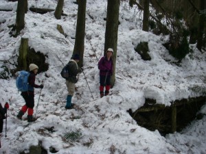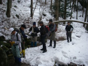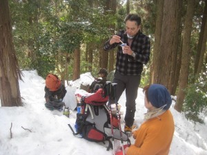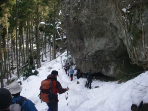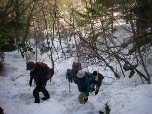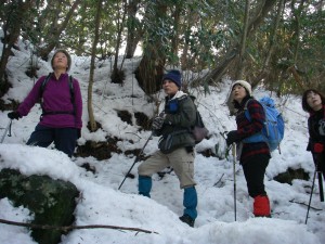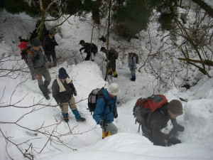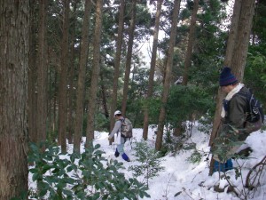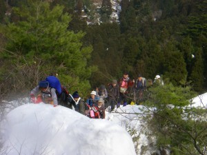 | 玉屋神社方面へと向かう | 雪の重みで耐えられなくなった杉 | 自然の力に感心するメンバー |