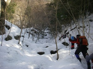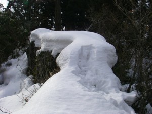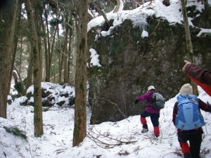 | 登山道をはずれ、谷を上ると大きな岩の横を通る | 雪はどんどん深くなる | 谷を詰める |