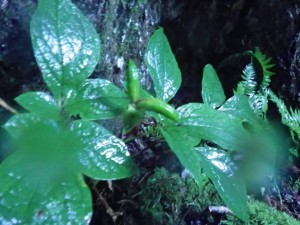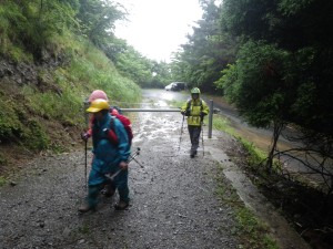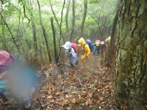 2012年6月24日 天気 雨 「自然観察とボランティアの山の会」の8月例会登山は、裏英彦山である。今日はその下見である。梅雨なので雨は当たり前だが、どうやら今日は本降りのようで中止の声もあったが、とにかく現地まで行ってみようとなった。 ■出発時間:6時30分(Hさんの会社) ■メンバー 男性3名 女性4名 薬師林道から薬師峠へと進み、その先の取り付き(登山口)より植林帯へと入る。雨のためカメラのレンズが濡れてうまく写真が撮れない。尾根に取り付くと自然林へと変わり、滑りやすい急斜面を苦労しながらクリアして行く。いつまなら右手に望雲台の断崖絶壁が見えるのだが、今日はガスって全く見えない。ヤセ尾根から山腹へと少し降るとここからが裏彦ルートの見所が続くはずであるが、足元はとにかくぬかるんで滑りやすく景色どころではない。確かに雨は木々のおかげか、あまり降っていないように感じるが、登山道はいつもと違う。何度か苔むした岩場のある谷間を越えて笹の中を抜けると大きな岩ばかりの谷を今度は降る。赤テープが目印だが、大凡斜めに降ればケルンの谷に出るはずだ。今回のルートは私以外全員初めてとのことで先頭は私が勤める。降るにつれ予想通り水の流れる音が強くなって行く。その音を目の前に感じると木々の間から白い流体が見えてきた。ケルンの谷だ。いつもは、ほとんど水が流れていないのに今日はとんでもなく水が噴き出ている。全員降り立つが、いつものケルンの谷を知っている人はいないのでそのギャップに驚く人はいない。ただ、すごい勢いの水が噴き出していることには驚いていた。今日はこれ以上危険だと判断し、ここで引き返すことに。薬師峠の登山口に無事下山。林道に出ると雨は結構降っていた。木々がいかに雨を受けてくれているか、よくわかる。雨による水の怖さを感じた山行だった。 |